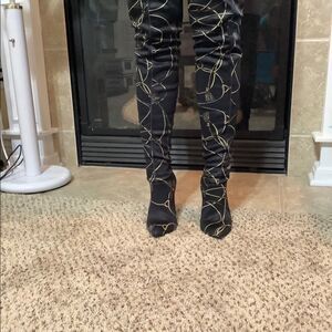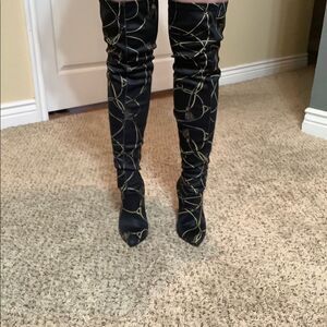Beautiful scarf print boots. The material is textile. The heel height is 4.5". The shaft height is 22". The calf circumference is 16". Pictures don't do them justice. Size is 7. NWT