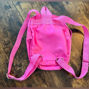 Adorable hot pink sateen Hello Kitty backpack. White sateen hello kitty face on front. Kitty’s silver bow is pleather and has a few knicks in it. The bag is trimmed in the same silver pleather and there are a few knicks in it. The front has stitched white bows. The inside has a zippered closed pocket. 3/4” wide webbed, fully adjustable, backpack straps. Silver tone metal hardware. Good used condition. From 2017.