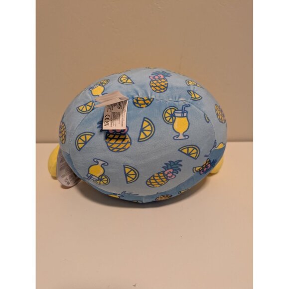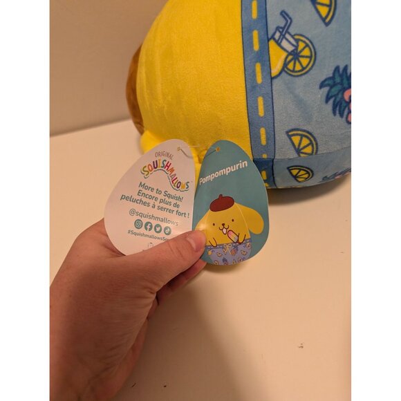 This delightful Sanrio 2023 Pompompurin Squishmallow plush toy is a cuddly companion featuring a charming yellow and blue design. Its soft, squishy build makes it perfect for hugging and collecting. The adorable Pompompurin character, adorned with a playful summer print, brings a touch of cheer to any room.