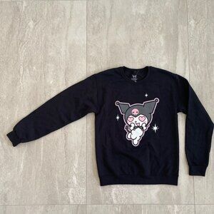 SANRIO Adult Size Small Soft Cozy Sweatshirt Featuring Friends Hello Kitty My Melody Kuromi Heart Eyes Cinnamoroll Pullover Sweater Crewneck Long Sleeve Black NEW. It's a long-sleeved pullover sweater, perfect for women who love comfortable and chic clothing.