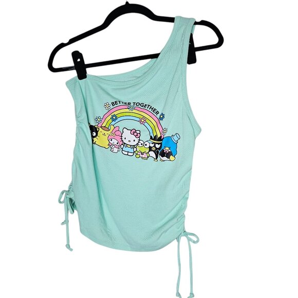 Minty green one shoulder tank top with adjustable ruched sides. Hello kitty and friends graphic.