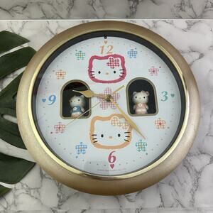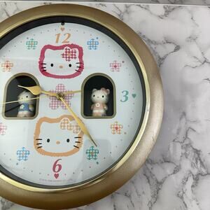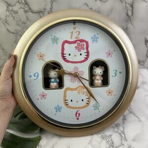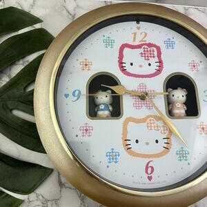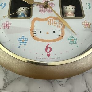 Vintage 90s Sanrio Hello Kitty floral wall clock with music and spinning figures. The clock works and keeps time. The spinning figures do not consistently work. It measures about 12.5 inches across.