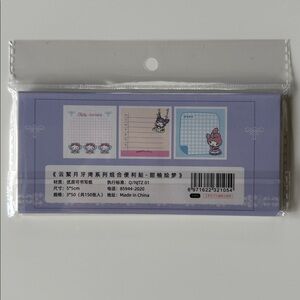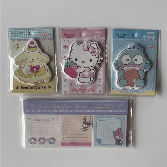 Adorable Sanrio sticky note set featuring Pompompurin, Hello Kitty, Hangyodon, My Melody, and Kuromi.