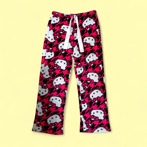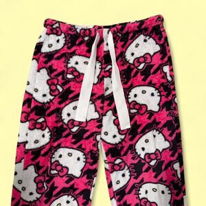 pink fleece, Hello Kitty, kawaii loungewear, cozy pajamas, 2000s style, cartoon print, fitted, soft fleece, cute sleepwear, nostalgic