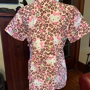 "Sanrio-Hello Kitty" scrub top, size medium, short sleeves. Color: pink with brown leopard spot print.Two front pockets. Side tie and drawstring (front side only). Small ruffles around collar. Fabric: 65% polyester, 35% cotton. Measurements (approximate): neck (all around) = 28", chest (flat) = 21.5", front length (mid shoulder to bottom) = 27.5", back length (mid shoulder to bottom) = 27.5". Like new condition. Thanks for looking!