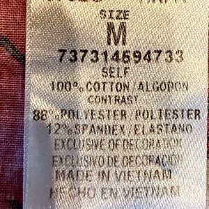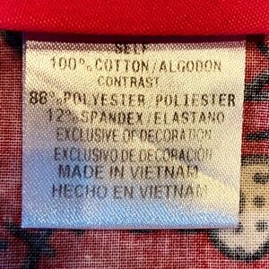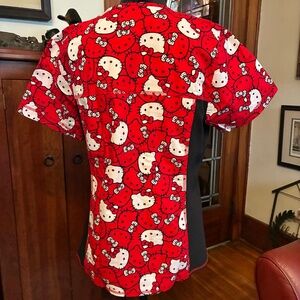 "Sanrio-Hello Kitty" scrub top, size medium, short sleeve. Red base, with black, elastic side panels. Hello Kitty images, outlined in black. Two front pockets. Elastic gathering, in back, at waist. Fabric: 100% cotton, contrast, 88% polyester, 12% spandex. Measurements (approximate): neck (all around) = 26", chest (flat) = 20.5", front length(from point of "V" neckline to bottom) = 20.5", back length (mid collar to bottom) = 26". Liken new condition. Thanks for looking!