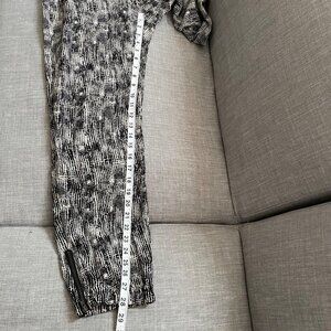 These Sans Souci pull on pants are lightweight and comfortable. These have a fun geometric print throughout the pants. They are black and white and have an elastic waist. These are in EUC with no rips, stains or holes. Please see pictures for measurements. These are the perfect pair of pants to lounge around in, but can also pair nicely with a plain blouse.