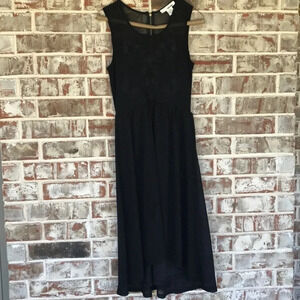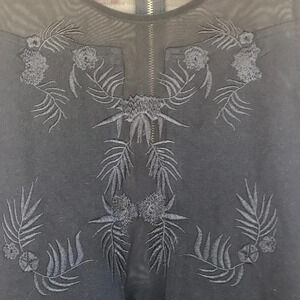 This is a beautiful little black midi dress. It features a round neck, bodice of knit and sheer fabric embroidered with black florals. It is sheer at top showing shoulders and down the center to the waist showing cleavage but the rest of the bodice is thick on both sides of center in front and back. Back sports a gold zipper. Gathered at the waist, the skirt is lined and flowy. Hem is higher in front than in back. Great condition!