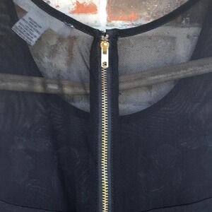 This is a beautiful little black midi dress. It features a round neck, bodice of knit and sheer fabric embroidered with black florals. It is sheer at top showing shoulders and down the center to the waist showing cleavage but the rest of the bodice is thick on both sides of center in front and back. Back sports a gold zipper. Gathered at the waist, the skirt is lined and flowy. Hem is higher in front than in back. Great condition!