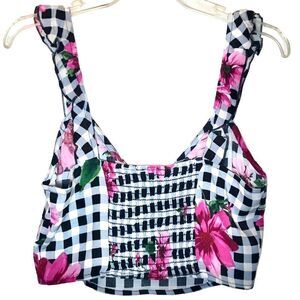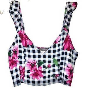 This NWOT floral check cropped top has ruffles along the straps and a stretchy smocked panel on the back.
