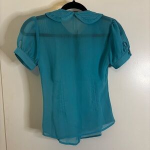 Cute vintage inspired collared blouse with a button down front. Sheer material with a Peter Pan collar front and back and puffed sleeves.