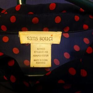 This stylish Sans Souci blouse features a fun polka dot pattern. The classic black and white design makes it a versatile addition to any wardrobe. Perfect for dressing up or down, this blouse is in excellent condition and ready for a new home.