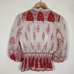 Sans Souci silk cotton blend slightly sheer open front top. Elastic tie waist. Pretty puffed and puckered sleeve. Red and white boho print. Size listed as Large.