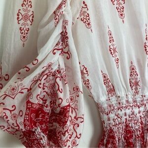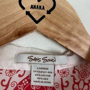 Sans Souci silk cotton blend slightly sheer open front top. Elastic tie waist. Pretty puffed and puckered sleeve. Red and white boho print. Size listed as Large.
