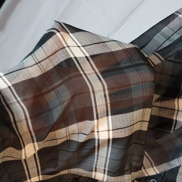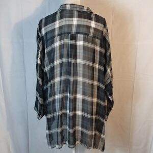 This sheer black and white plaid long sleeve Sans Souci oversized button down blouse is a size Medium with a pit to pit measuring 29". In excellent condition. All offers are welcome.