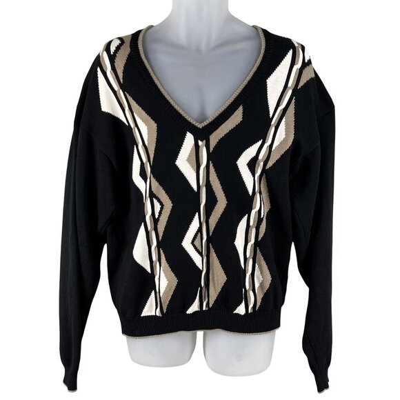 Sansabelt Sport Mens M V-Neck Black Cotton Sweater Geometric Pattern Timeless