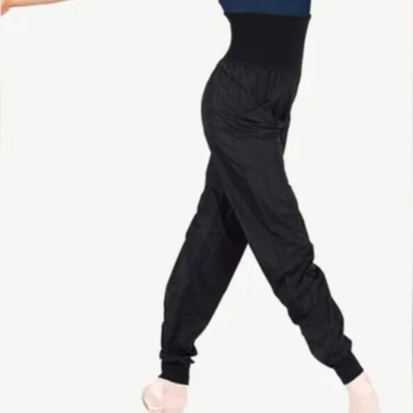 A favorite among dancers, these "trash bag" warmup pants feature an acrylic fabric designed to hold in body heat, a thick ribbed high waist to keep abdominal muscles warm, and ribbed ankle cuffs that allow the dancer to wear pants long, or as capris.