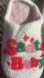 Cozy slippers with 'Santa Baby' design. Features red, green, and white colors.