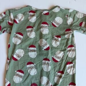 Size 18-24 months, short sleeve holiday print pajamas. Gorgeous green with Santa print. Faux wood buttons up the chest. Snap closure between legs for easy diaper changes. 97% Viscose and 3% Bamboo. Buttery soft. Light wear, very good used condition.