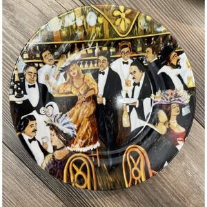 This product is a set of 3 Santa Barbara Guy Buffet French scene cocktail dessert salad plates. The round ceramic plates feature a vintage/retro style design with a multicolor French scene, making them versatile for all occasions. Perfect for adults looking to add a touch of elegance to their dining experience, this original plate set is sure to impress guests and elevate any table setting.