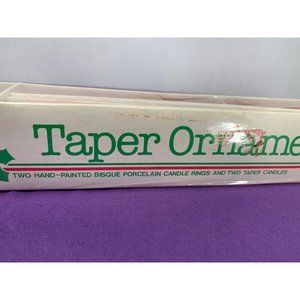 Vintage taper ornament set featuring two beautifully hand-painted bisque porcelain candle rings, perfect for taper candles. Made in Taiwan, these ornaments exude a nostalgic, old-world charm.