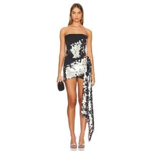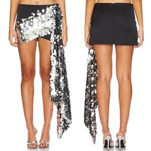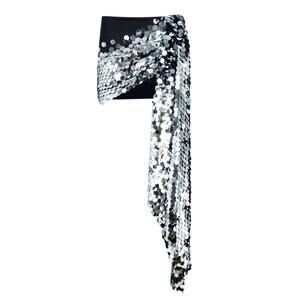 Black mini skirt highlighted by a shimmering cascading silver sequin tail that drapes down one side.