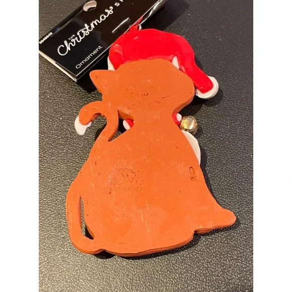 This adorable ornament features a jolly orange cat wearing a Santa hat and a festive bell. Perfect for adding feline charm to your holiday decor.