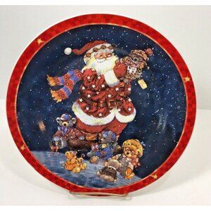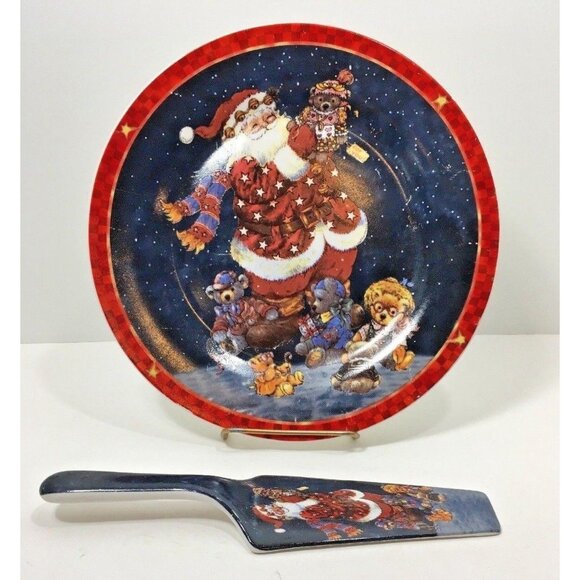 Santa Claus Christmas Cake Plate w Server Holiday Party Platter Teddy Bear Toy