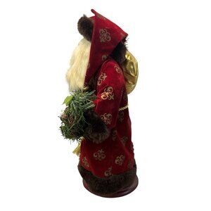 Festive Santa Claus figurine with a red velvet robe detailed in gold and faux fur trim. Features holiday wreath and sack with intricate detailing. Stands 15” tall. Plastic body.