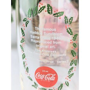 Clean set of two Coca-Cola Christmas Santa Claus collectible drinking glasses. Each glass features a reproduction transfer of a 1946 Haddon Sundblom Santa Claus original art. Each glass is 6 inches tall and taper slightly toward the top where they measure approximately 2.5 inches diameter at the rim. The bottoms sit nicely in your hand. Both glasses are labeled The Coca-Cola Company and The Archives [Two of three Series II]. They are in excellent vintage condition and would make a unique gift for the holiday. Perfect nostalgic Coca-Cola memorabilia.