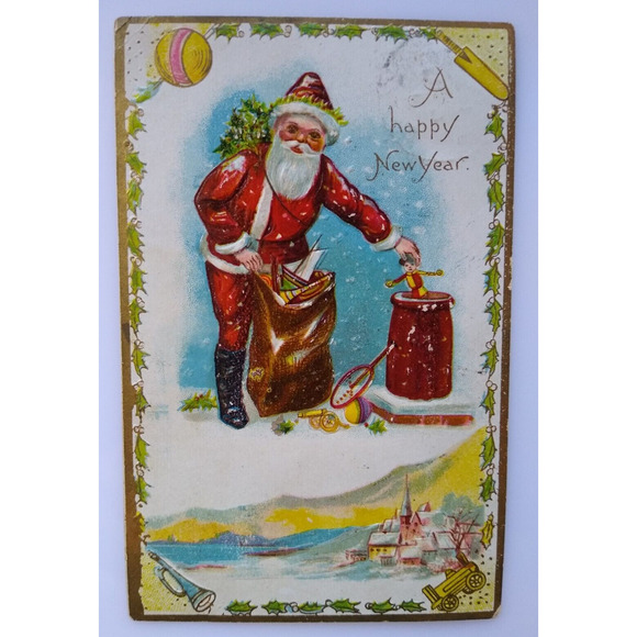 Santa Claus Father New Years Christmas Postcard Standing On Roof Toys Embossed
