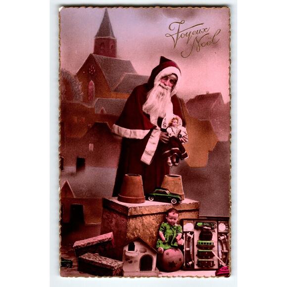 Unposted. French made gel coat finish with deckled edges. Antique original vintage post card. Has curling, corner dings, and age wear. Stock #santa289.
