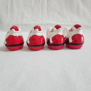 Lot of 4 Vintage OCI Omnibus Roly Poly Santa Claus Ceramic Christmas Napkin Rings. Super cute 80s style. Each is about 2.5" tall and 4" wide. Original stickers on the bottom of some. Great for the kids table at Christmas dinner!