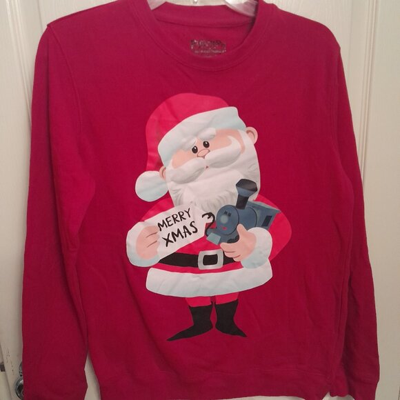 Red, cuffed sleeves and bottom. Like new. Santa with a train gift. Poly/cotton blend.