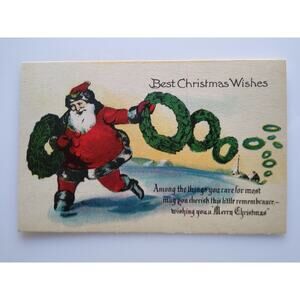 Santa Claus Throws Xmas Wreathes Christmas Postcard Metropolitan News Unused 350