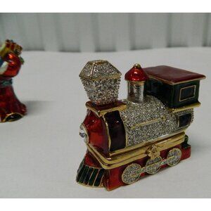 A festive Santa Claus and train figurine set featuring hand-painted enamel and rhinestones. Hinged trinket boxes add functionality to holiday decor.