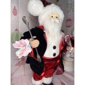 Santa is decked out in a shiny red suit with black velvet jacket holding a red martini with candy cane garnish in one hand and spook/fork in the other