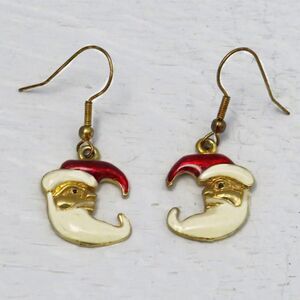 These crescent moon shaped Santa earrings are so fun to wear. They are lightweight and comfortable, and will fit with a variety of settings during the Christmas holiday season. These dangle earrings are suspended from gold toned French hook and hang approximately 1 3/4 inches long. The face and beard appear to be enamel.