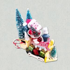 All aboard for holiday cheer! This whimsical Christmas assemblage features Santa joyfully driving a vintage toy train through a snowy landscape of bottle brush trees and cute embellishments.