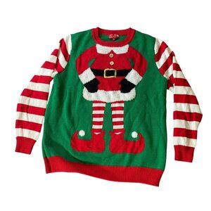Santa Elf Christmas Sweater Green Red Striped Sleeves Fun Design XL