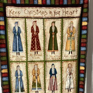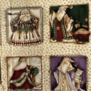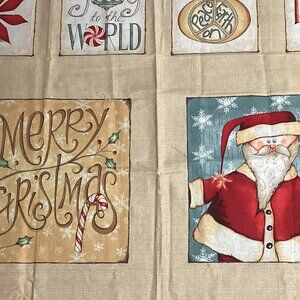 Camp Christmas (Photo 7 -33"x43") by J. Wecker-Frisch, Santa and friends at camp. Keep Santa in your Heart (Photo 6-23"x42") panel depicts 12 months of Santas. Holiday words, Santa and other holiday features on 23" square panel is shown in photo 9. Some of the Nine Old World Santa Blocks on 23"x22" piece are shown on photo 5. And 2 extra sized fat quarters seen in photo 8, but sizes shown are reversed. All 100% cotton. Weight 2 pounds so can be bundled with any items under 3 pounds.