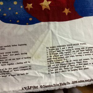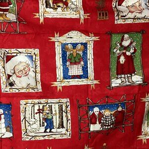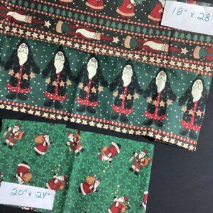 A bit over 5 yards total of different fabric with Santa and some friends! In photos 1 through 4 are "Mr. and Mrs. Santa Claus" which is a 35"x60" door panel. It does have tiny spot stains to the right of Santa's head under the word Claus. Barely noticeable, but fabric has not been washed. (A few larger spots on instructions.) (Already discounted for stain) There is 1 piece from Henry Glass, one yard of black printed Santas on red. in photo 10. Santa with green sack along with bird houses and birds near top right cover is no longer included.