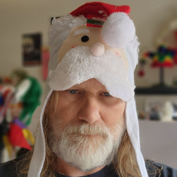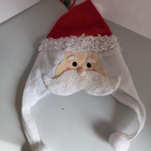 A White bearded and haired, cream faced felt Santa face hat with Red top, white snowball tasseled Felt hat. As is, no returns. Measures approx. 22" x 11" flat. See photos for description, details, condition.