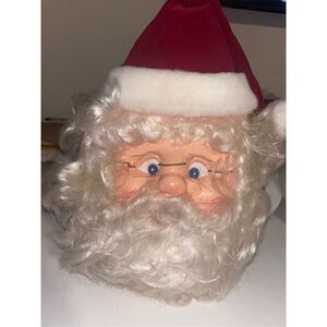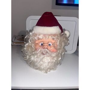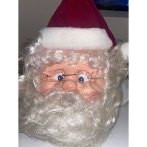 Vintage old Timey, Santa face. He's got a full beard, little pink lips and square pointy glasses. He's got a red cap with his white for trim. He takes four AA batteries. I could not get him to work. It is an old Timey it has a plastic stand attached to the back of it.