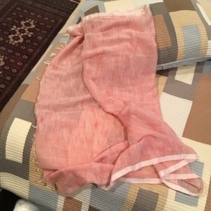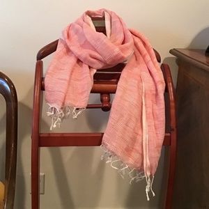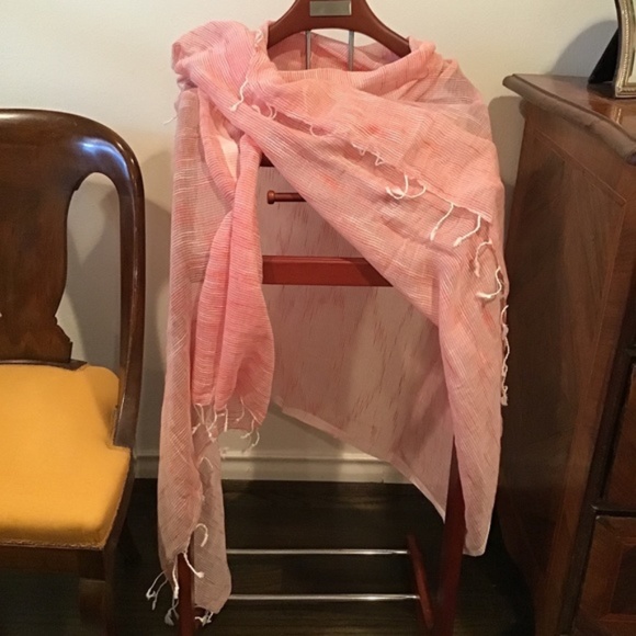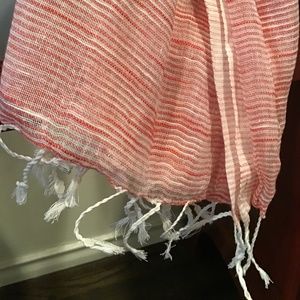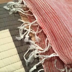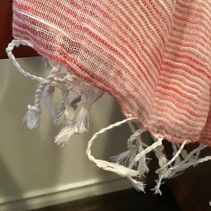 Generously sized Red & White Linen Scarf hand finished with twisted and knotted fringes. Light weight and soft. It feels clean around your neck, looks good, and makes you look good. Layer on for a touch of flattering color, or an easy coverup. The red & white combination is subtle, flattering and versatile, the softest, lightest linen to float around your neck. Bought in a boutique in Santa Fe. Like new, from smoke free house. 70” x 42” + 2” fringes.