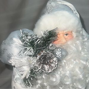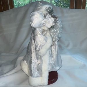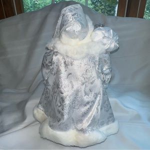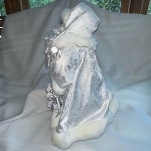 Silver and White Brocade Coat and Stocking Cap Trimmed in Plush White Faux Fur