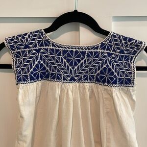 Beautiful cream color dress with blue cross stitch embroidery at neckline. Made in Mexico. Size small. Excellent condition.