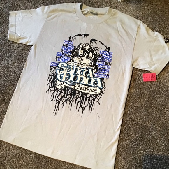 Iconic Santa Monica streets are immortalized on this SM Natives original art tshirt. Light gray tee with black, blue and white print. NEW.