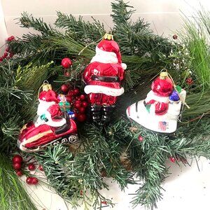 These beautiful ornaments are made of glass and hand painted. This is a vintage collection from Dillards in 2001. The Santa in the center is a big one with a bag filled with toys. He measures 7" tall x 4" wide. The Santa on the left is an Snow mobile filled with presents and he measures 4 1/2" hi x 4" long. The Santa on the right is in a space ship filled with toys and on the wing you have a glitter American flag and hand painted USA in black.