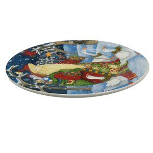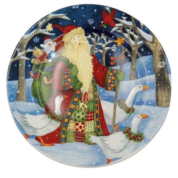 This Gibson Everyday stoneware plate features a charming Santa with geese design by Debi Hron from 2010. At 7.5 inches, it's perfect for holiday appetizers, desserts or Santa's cookies and the reindeer's carrots.
